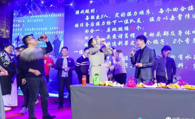 年会中各部门员工各展所长,为大家带来了精彩绝伦的视听盛宴。其中舞蹈《旗开得胜》、动感的RAP与歌曲串烧《程序员之歌》、轻松幽默的三句半《夸夸咱公司》等节目带我们嗨翻全场,高潮迭起,令人目不暇接。表演期间穿插了互动小游戏与抽奖环节,五等奖到神秘大奖,奖品丰厚,员工们的热情,将现场的氛围推向又一个高潮,台下一片欢声笑语,昔日的汗水都化为杯中的美酒,大家举杯共饮,同为天行庆生。