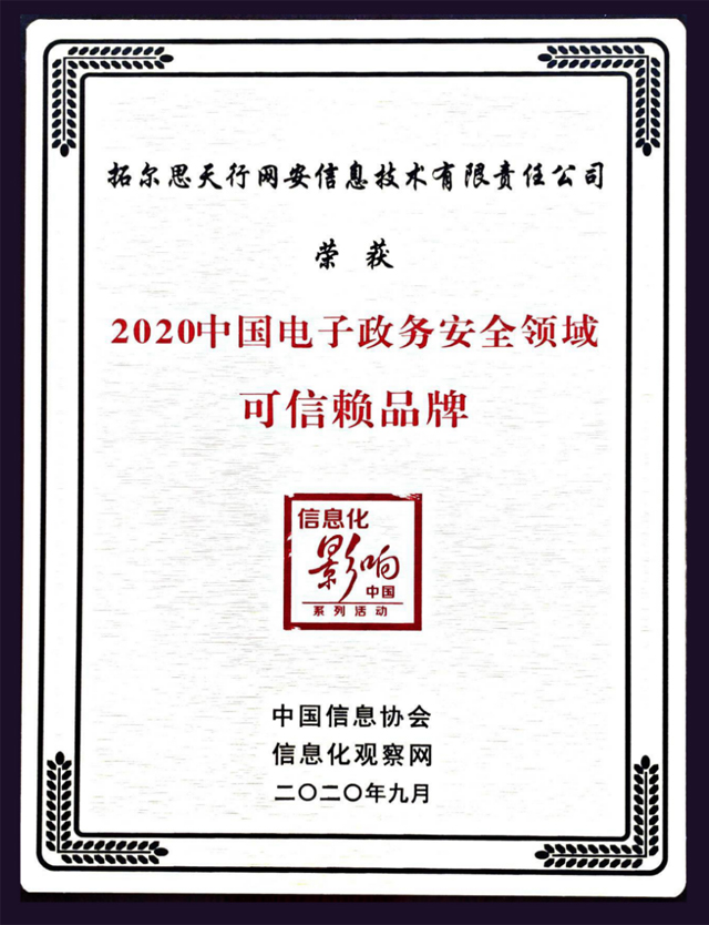 会中,主办方对2020年电子政务安全领域业绩突出的企业及优秀项目进行了表彰,拓尔思天行网安荣获“电子政务安全领域可信赖品牌”。