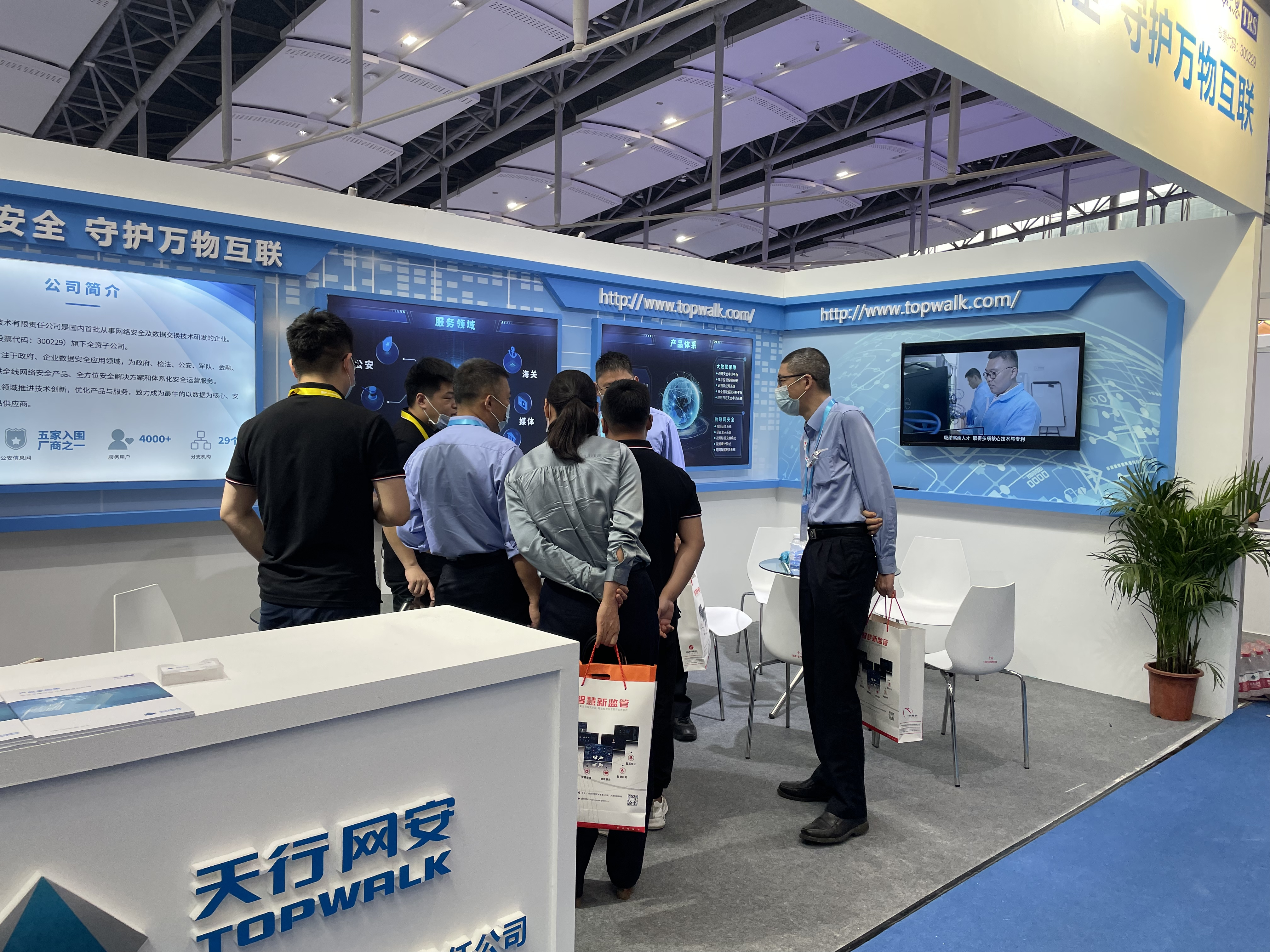 通过现场演示+口述讲解的方式,向观展嘉宾近距离介绍公司业务和产品。其中边界安全运维产品“Topwalk—BOP”作为本次展示产品之一,以动态安全防护、安全事件追溯、资产画像、设备监控分析和大数据可视化统计分析等优点,解决了用户无法实时掌握边界建设及运行情况的痛点。可视化展示边界建设现状,实时反映边界安全状态,简易操作的运维管理方式,得到了众多嘉宾肯定和认可。