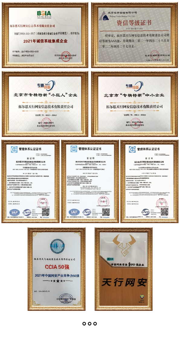 2021年,天行网安秉承“创新、持续改进、分享、高效协作、激情、勤奋、真诚”的核心价值观,多项工作受到了政府、行业、机构及媒体的肯定,荣获“高新技术企业认定”、“北京市2021年度专精特新中小企业”、“小巨人”企业称号,入选“CCIA中国网络安全产业竞争力50强”、“安全牛《2021中国网络安全企业100强》”等多项荣誉和奖项,并深入参与《公安视频图像信息系统安全技术要求》标准编写。激励我们2022年向前,向前,继续向前!
