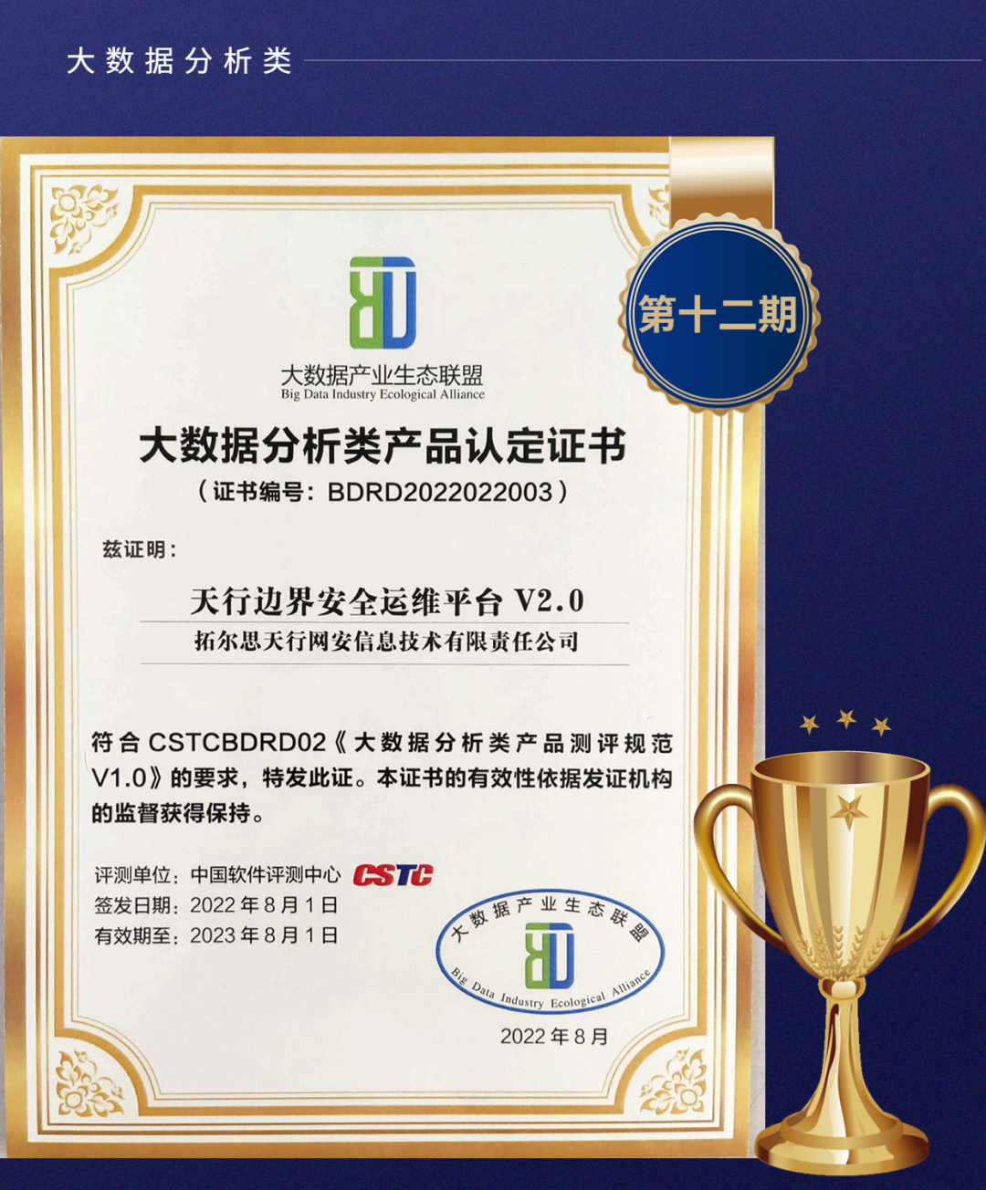 此次天行边界安全运维管理平台(Topwalk-BOP)获得大数据产业生态联盟的测评认证,这不仅是一份荣誉,更是一份沉甸甸的责任,既是对天行网安技术实力的肯定和认可,也是对天行网安的一份鞭策与激励。