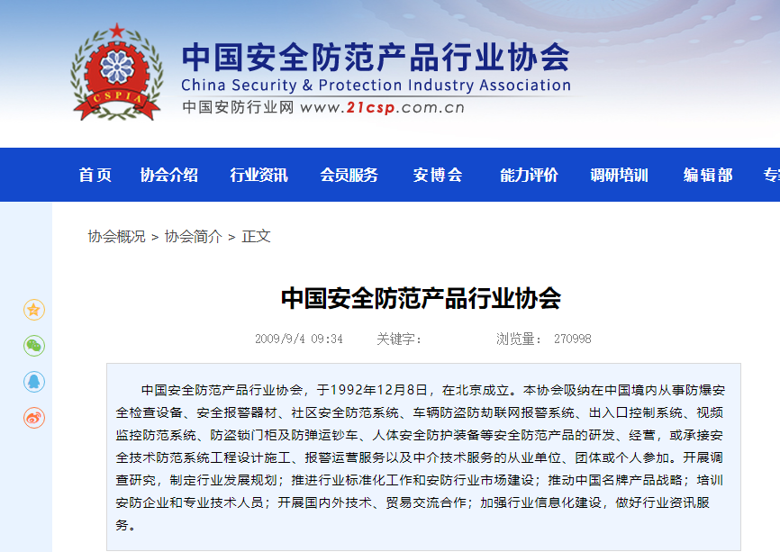 中国安全防范产品行业协会简称CSPIA,是唯一代表中国安全防范产品行业的、非赢利性的、自律性的社会团体。