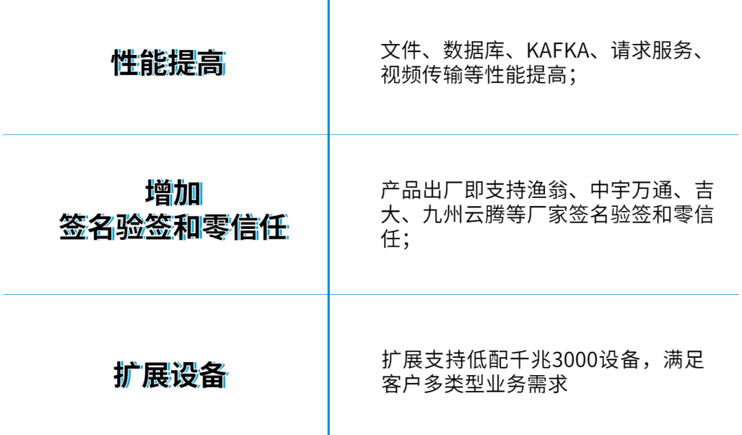 全新升级后,请求服务、视频传输等性能极大提高,同时支持对接高速通道,以及centos 7.9虚拟化云平台部署;拥有轻量化安装系统,采用具有独立自主知识产权的TOP OS操作系统,安全高效,可有效规避系统漏洞所带来的安全风险。具备强扩展性和高可靠性,集群部署可根据业务自由增减,且设备互为冗余节点,可有效保证业务的连续性。