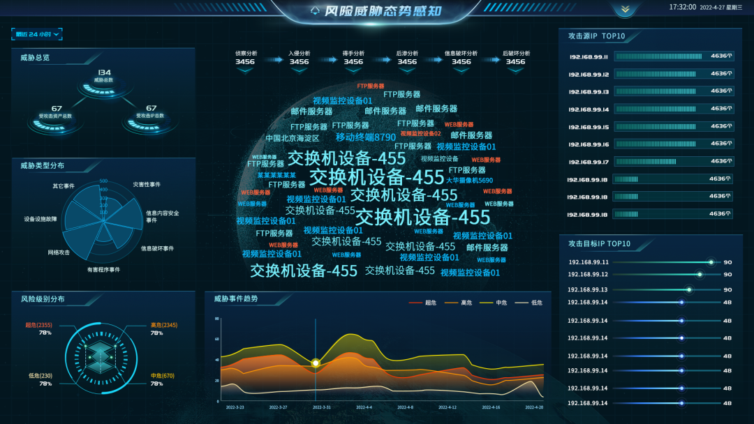 天行安全管理平台(Topwalk-SMP)以大数据分析架构为支撑,可为安全管理者提供资产量化风险评估、风险威胁监测、攻击溯源与预测等安全检测分析等手段,并结合通报预警、应急处置等安全运营功能,实现上下级平台安全通报、风险预警的上报与下达。