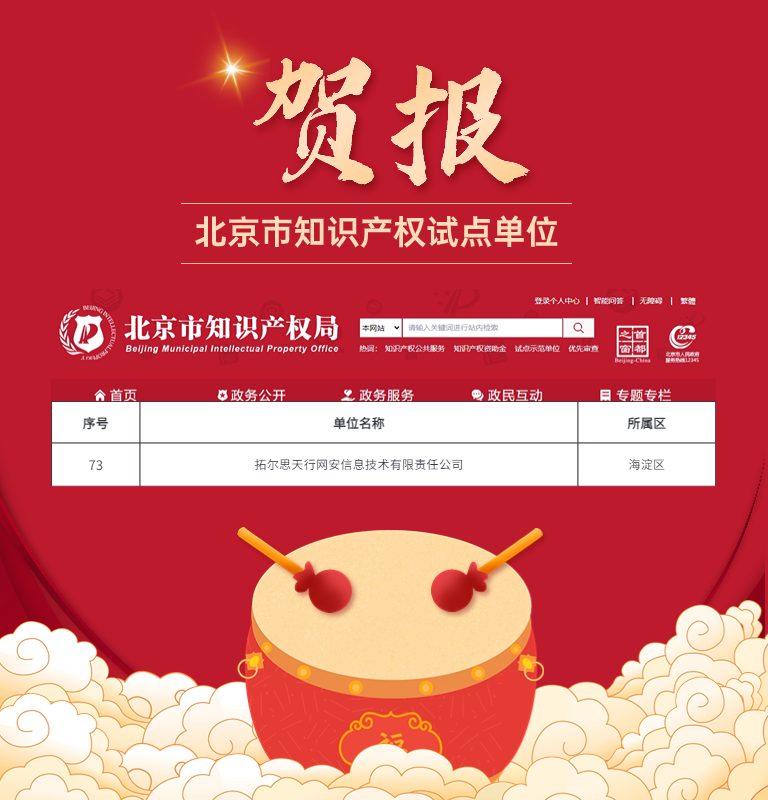 近期,北京市知识产权局正式公布了“2023年度北京市知识产权试点示范单位”,天行网安凭借其持续自主的核心技术实力、创新突出的成果转化应用能力,以及完善的知识产权保护与应用能力等优势,成功入选了这一殊荣。