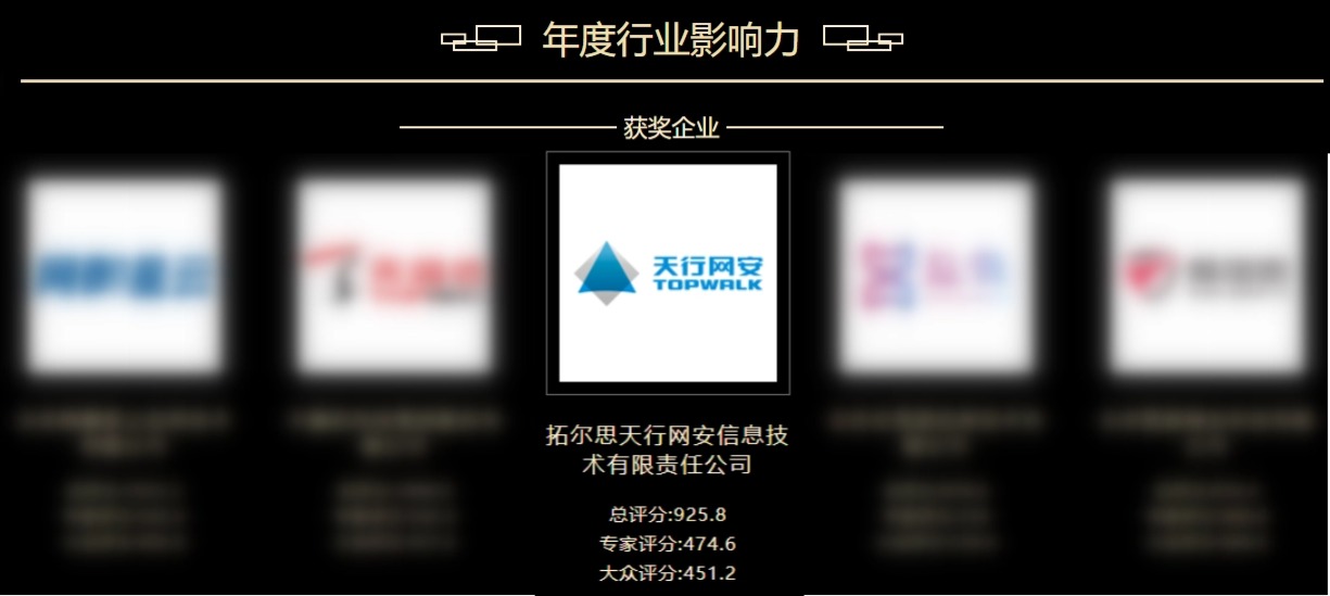经过激烈的评选投票及专家评审团的严格筛选,天行网安凭借其在网络安全领域的卓越成就与广泛影响力,在“年度行业影响力”奖项中脱颖而出,荣膺前五强。