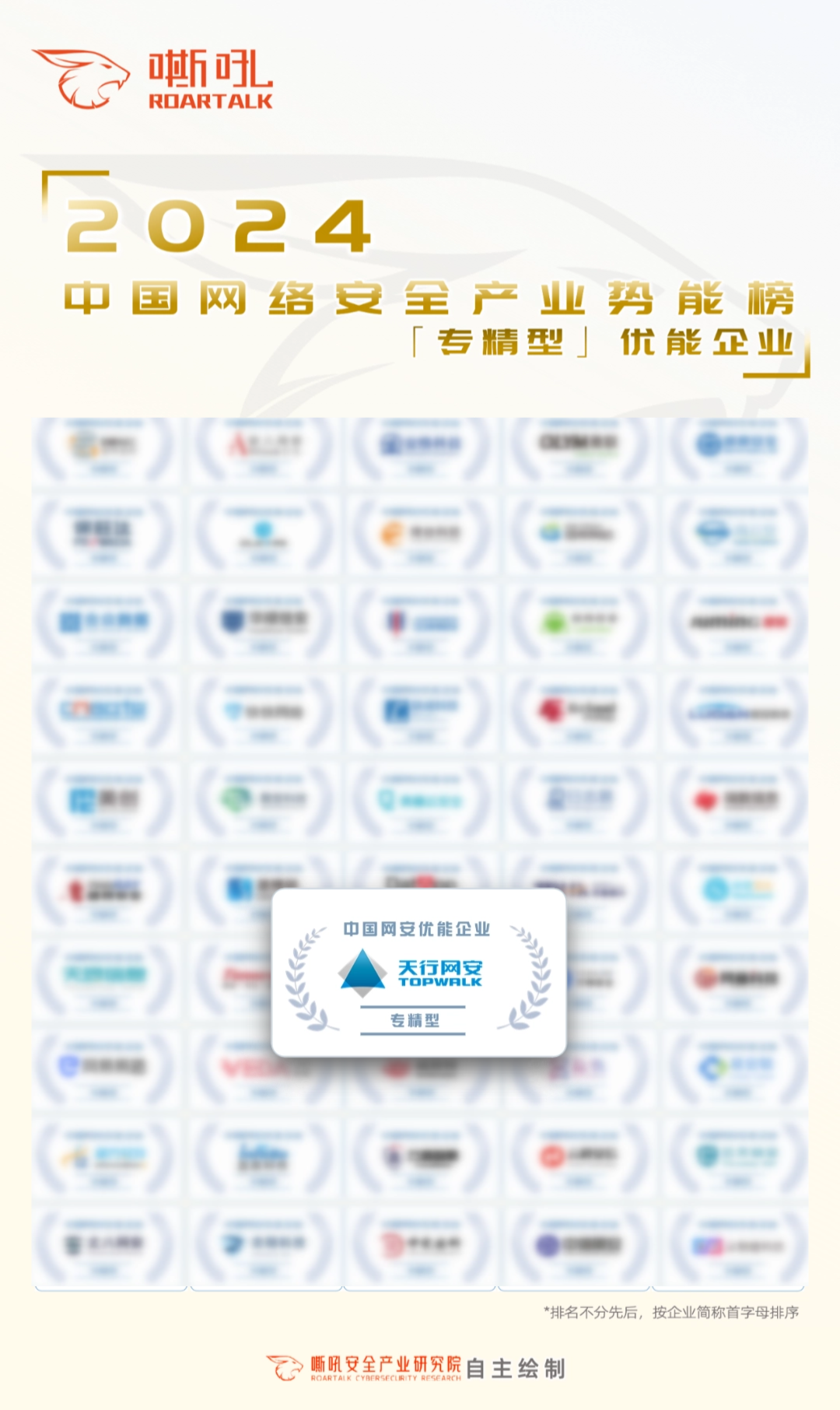 近日,由嘶吼安全产业研究院发起的《嘶吼2024中国网络安全产业势能榜》评选结果正式发布,天行网安凭借着领先的技术优势、产品创新能力及行业优秀案例,入选中国网络安全产业势能榜,被评为“专精型”优能厂商代表。