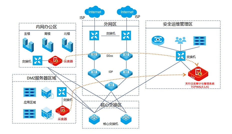 日志审计系统采用旁路部署,只需接入交换机与全部网络达成通信状态,不会影响用户现有的网络结构,可通过Syslog、SNMP trap、数据库、本地文件、Agent等多种方式接入日志,对日志进行解析、告警、存储、展示等操作。