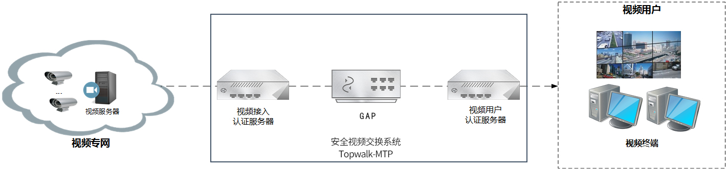天行安全视频交换系统(Topwalk-MTP)是一款集网络安全性和视频协议广泛适应性于一体,能够实现跨安全域多媒体数据交换的网络安全产品。产品由视频接入认证服务器(UMS)和视频用户认证服务器(TMS)组成,可实现视频监控图像等多媒体数据的安全接入,适用于公安、政府等单位需要实现跨安全域视频图像传输的应用场景。符合《1788.3-2021 公安视频图像信息系统安全技术要求第 3 部分:安全交互》技术要求。