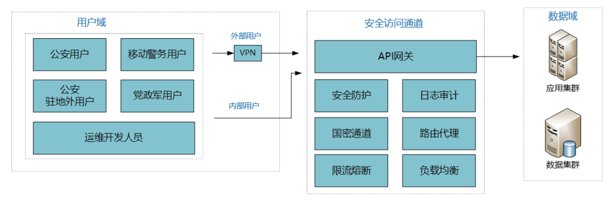 随着全国新一代公安信息网建设的推进,打破了网络壁垒,促进了数据融合共享,为公安信息化建设提供了可靠网络承载。同时公安各类终端用户访问汇聚,需要建立统一的安全访问通道,以满足用户高并发访问要求。天行API安全网关产品在新一代公安信息网部署后,位于用户域和公安数据域之间,通过管理授权和安全防护,实现安全访问平台的核心功能。达成公安数据汇聚节点与用户汇聚节点的安全互联,并以服务化的形式实现对数据资源的安全可信访问。